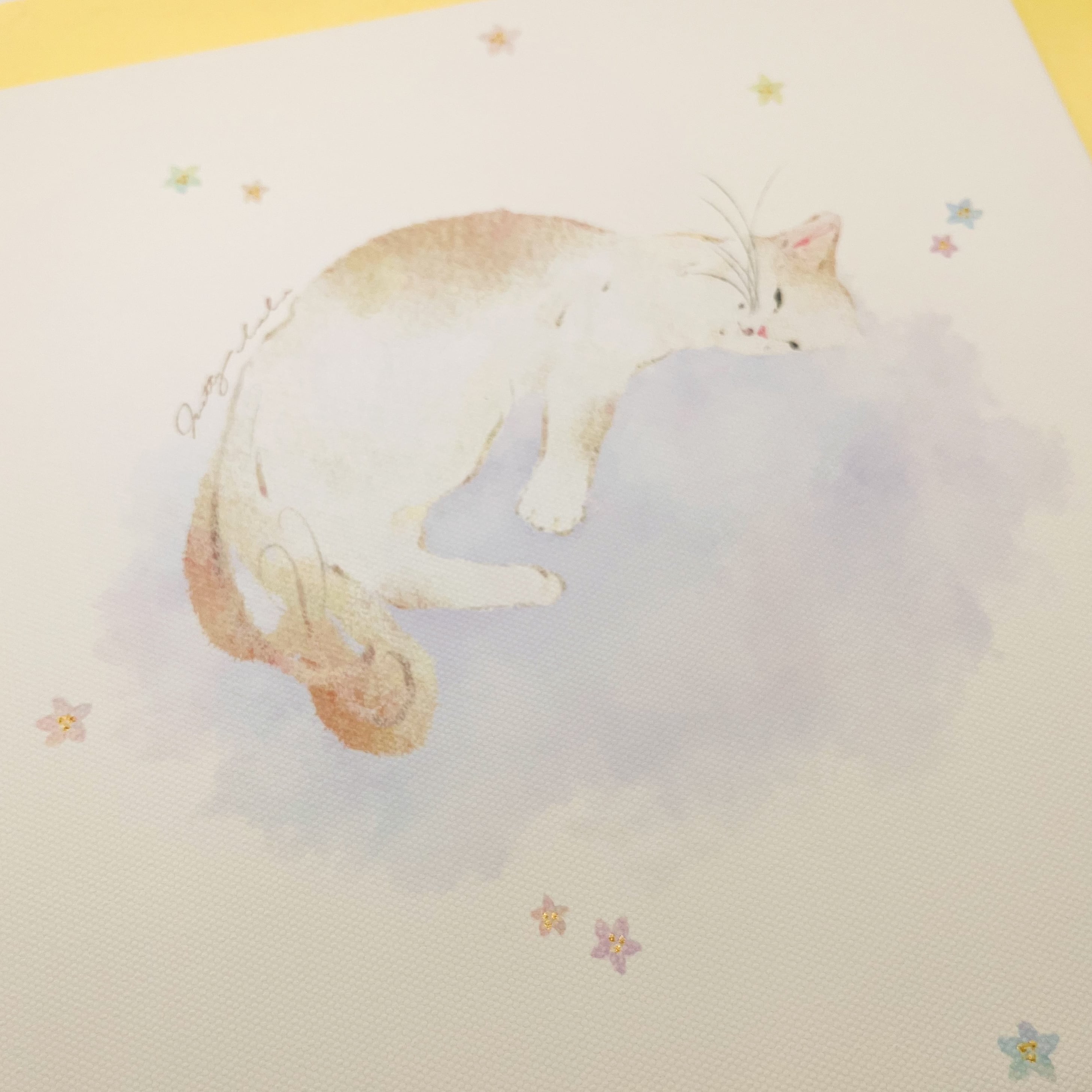 ⚪︎加筆部分:印刷されたイラストの上にメタリックのアクリル絵の具を塗り、花に煌めきを追加しています。