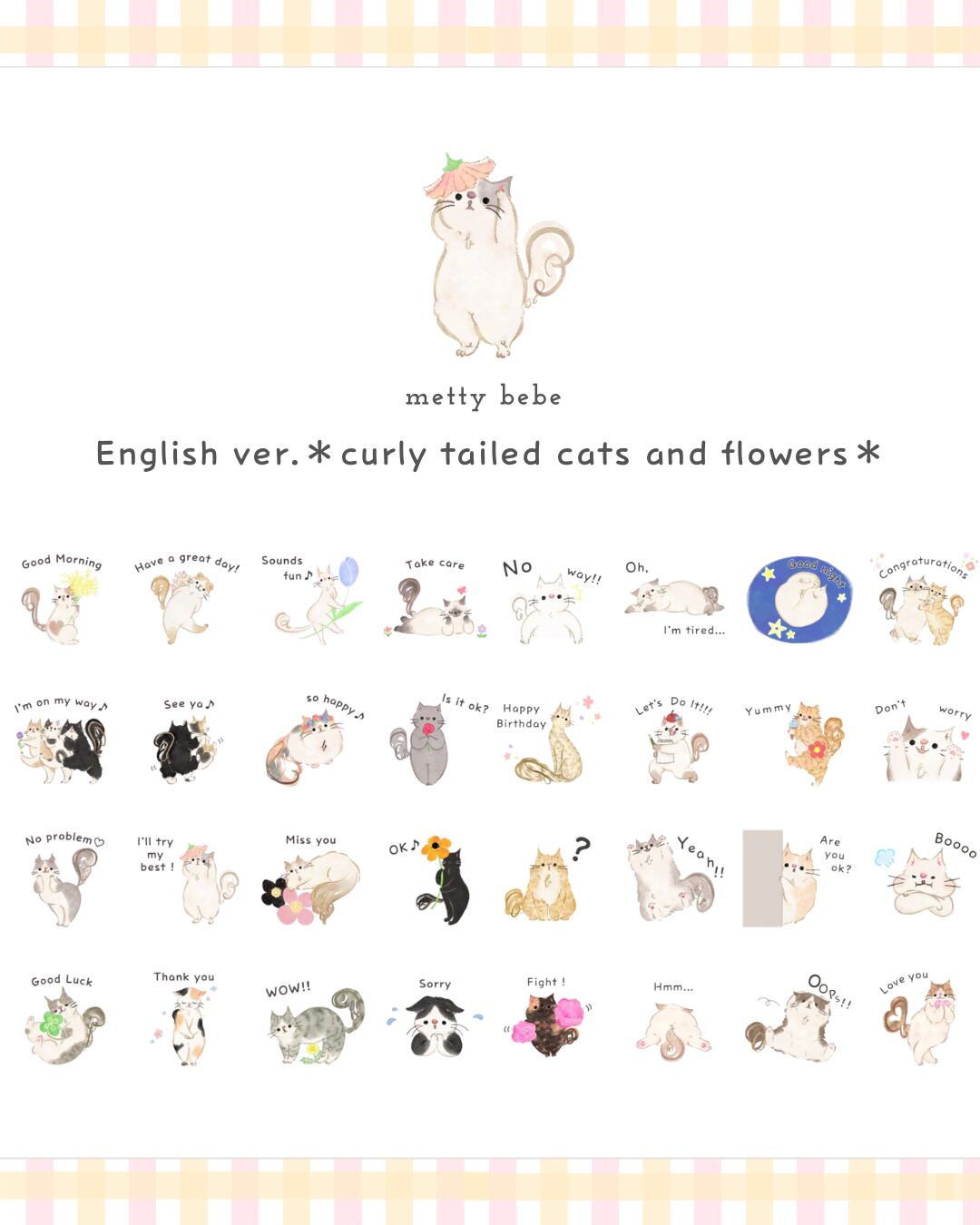 【English ver.】Curly tailed cats and flowers LINE stamps